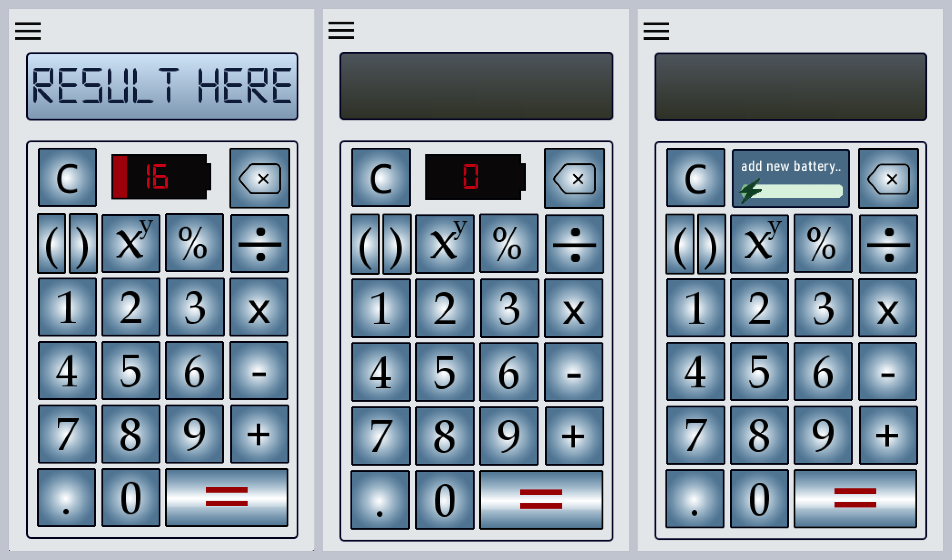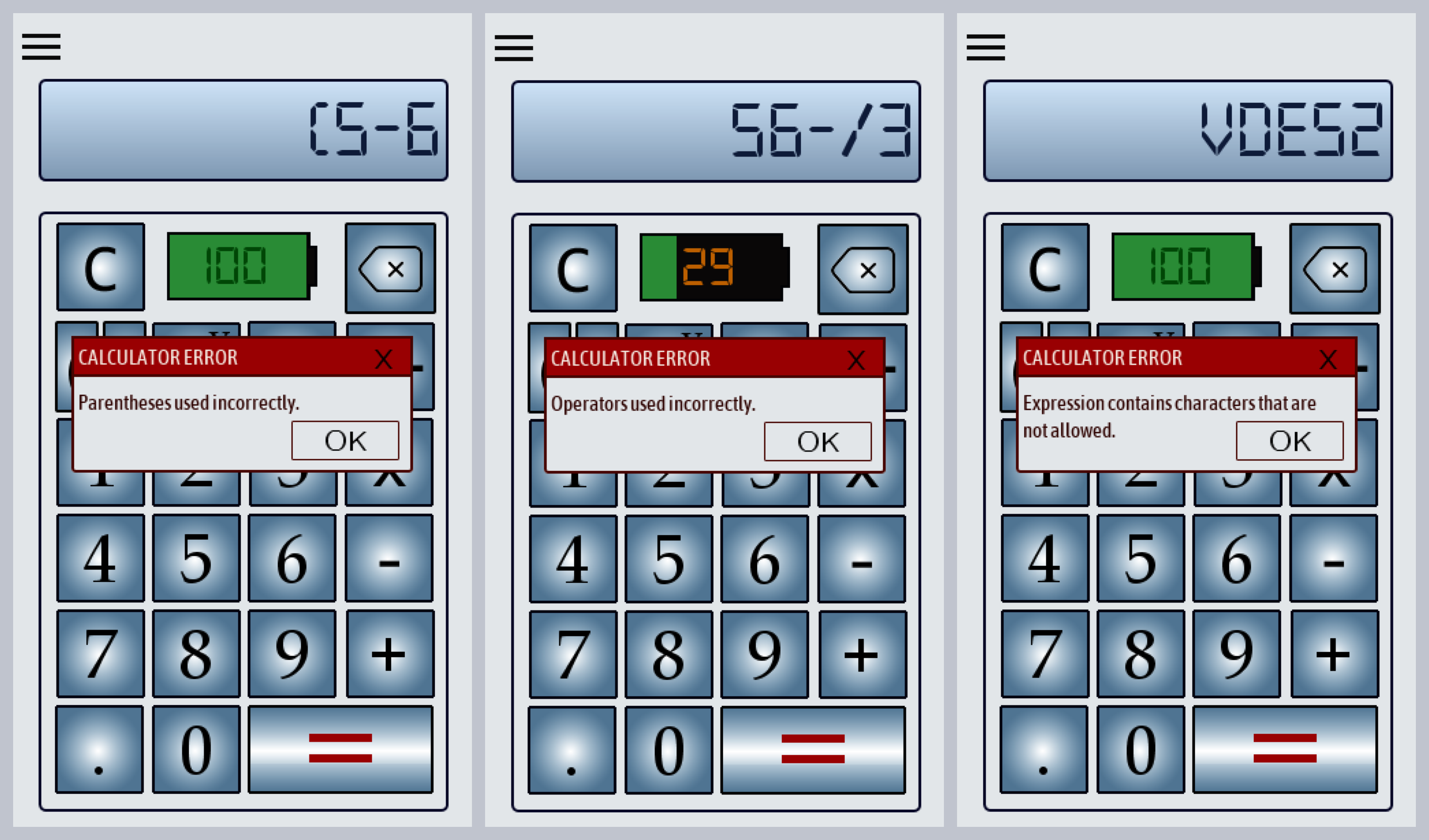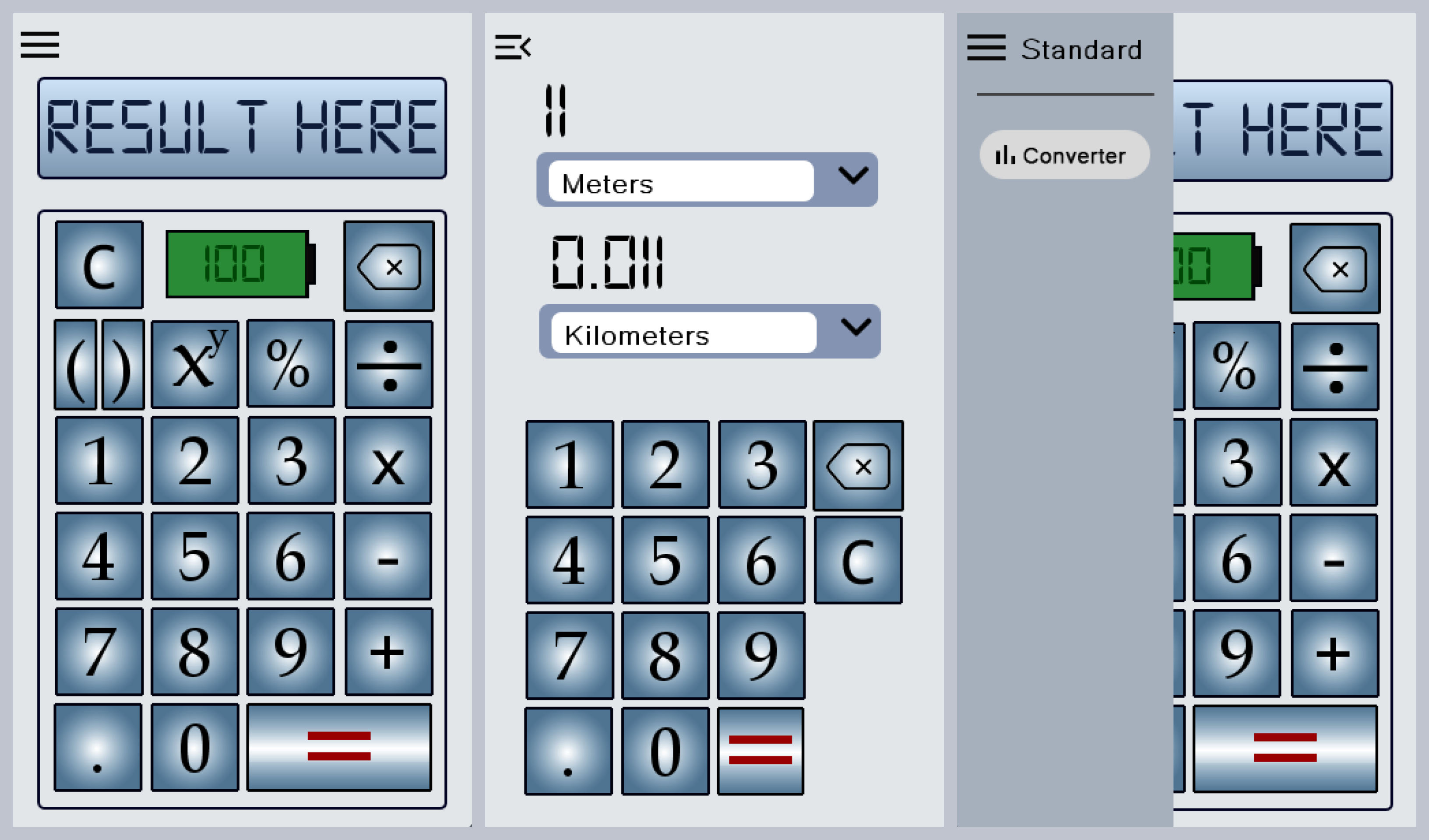 An application with two main components: a calculator and a length converter. A menu is available for switching between the components. User input is validated, and the battery percentage lowers while the calculator is being used.