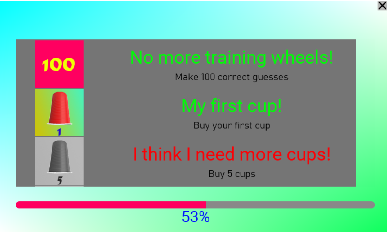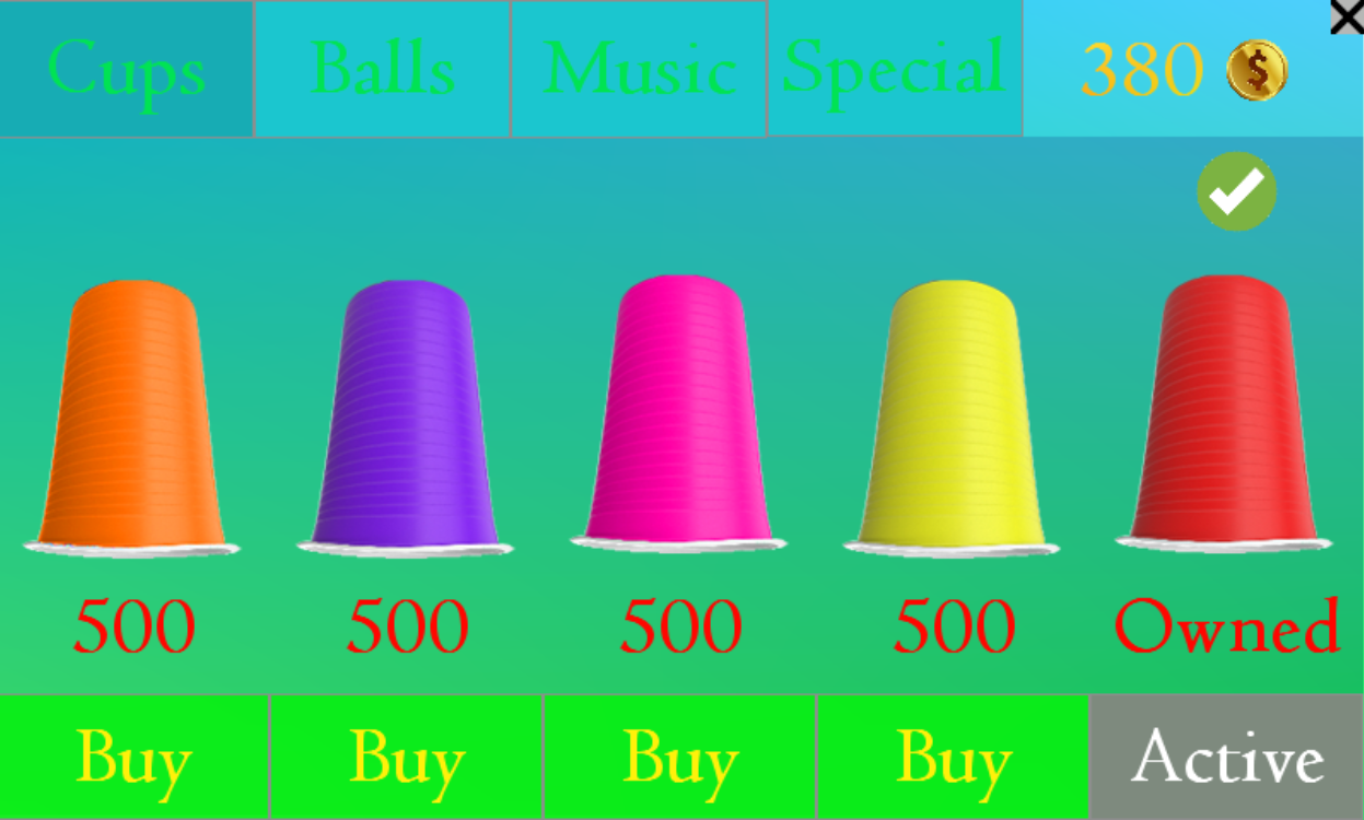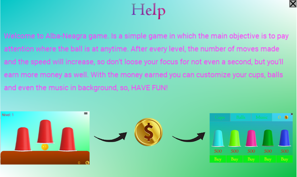 There are 3 cups and a ball, the position of the ball is shown, then the shuffle starts. Your objective is to keep track of the ball, and to choose the correct cup at the end. Gather enough money to use it in shop after some playing.